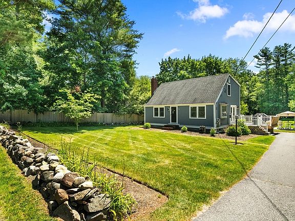 Welcome to this beautifully maintained 3-bedroom, 2 full bath Cape nestled on a 1.39-acre lot. Featuring classic New England charm and modern low-maintenance updates, this home offers the perfect blend of comfort, functionality, and outdoor enjoyment. Step into a cozy living room warmed by the wood burning stove and gleaming hardwood floors, perfect for relaxing evenings or hosting guests. The sunny kitchen opens through elegant French doors, bringing the beauty of the outdoors in. The finished lower level offers extra flex space for a home office/gym or playroom. The property is framed by picturesque stone walls enhanced by raised flower beds—ideal for garden enthusiasts. Two sheds provide ample storage, and a large Shelter Logic carport offers versatile space for vehicles, boats, or equipment. Additional upgrades include maintenance-free vinyl siding, central A/C, upgraded 200 amp electric, new bulkhead, new basement windows, new deck, newer furnace and generator hookup.