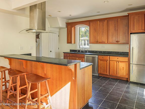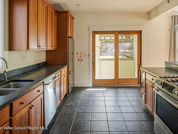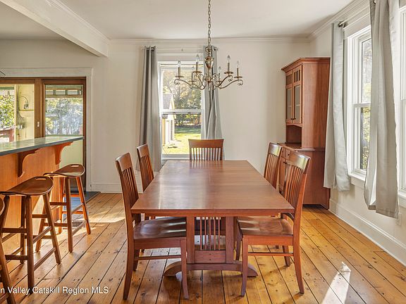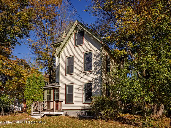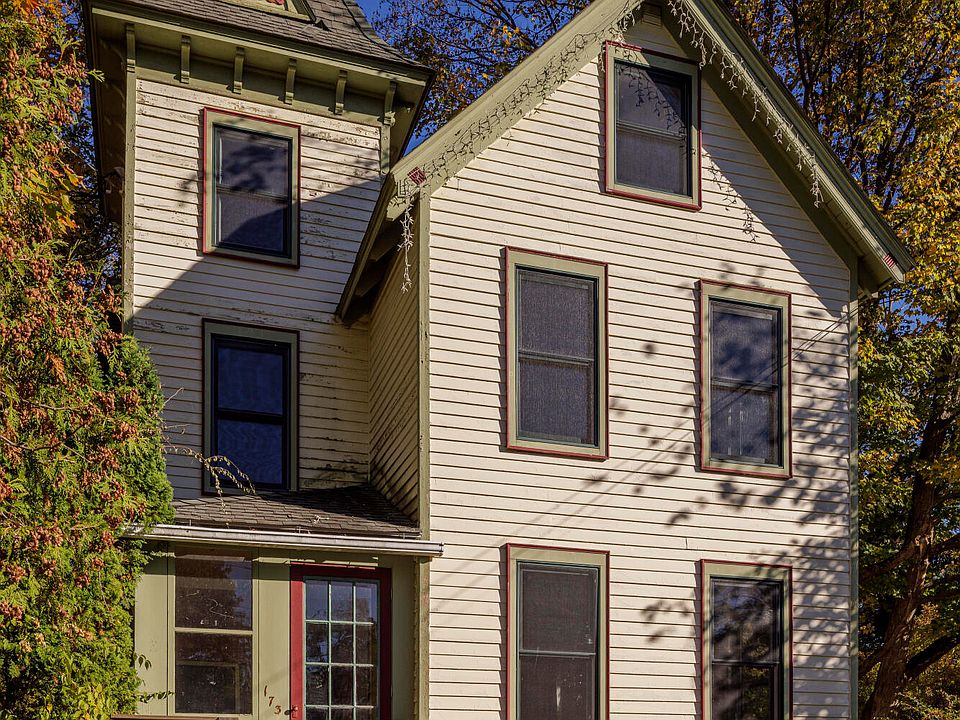 1892 Colonial thoughtfully renovated with hand crafted cherry kitchen. High ceilings, and large windows. Wood floors. Original detail. Three good sized bedrooms. Full attic finished off with plumbing ready for another bath. Wonderful location with private yard. Two car garage. Level land and seasonal stream. Walk to the village.