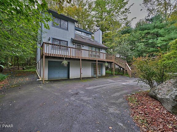 Great location on Lakeview Drive in a four season amenity filled community in The Northern Poconos, just two hours from the NYC and Philadelphia areas. This home is located on a nice level lot with a paved circular driveway. There's a front deck, a screened in porch and a large rear deck. The main living area has high ceilings with loft above and a fireplace. There's a bedroom and a bathroom on the main level. The second level consists of two bedrooms, a bathroom and the loft. The lower level has a finished family room and one car garage. This home needs a little TLC, but has a lot to offer. The amenities include lakes, beaches, pools, clubhouse with restaurant and pub, golf course, ski hill, tennis,