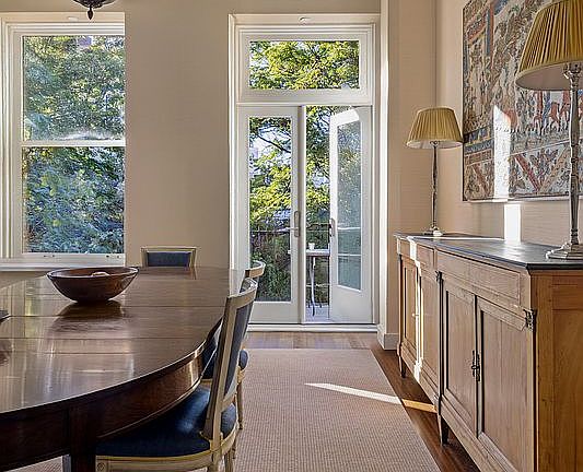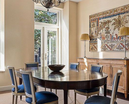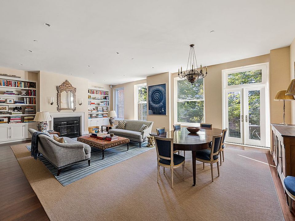 Tucked away on a tranquil residential block, the sun-filled, open-concept living room is anchored by a wood-burning fireplace and flows seamlessly to a private terrace—offering a peaceful retreat and a rare blend of indoor-outdoor living. Interiors by CeCe Barfield Inc. feature a remodeled kitchen with a Bluestar oven, custom-built storage, concealed drinks fridge, re-tiled primary bath, curated wallpaper, and a reimagined fireplace mantel. High ceilings and refined finishes complete the space.