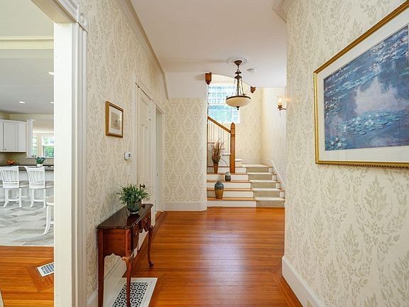 Much admired shingle style home on coveted Lower Main Street, close to Hingham's restaurants, shops and harbor. The architectural details are beautiful and include hardwood floors, intricate wood moldings and cabinetry. Spacious windows allow natural light and breezes. Warm and cozy fireplaces with period details, 10' ceilings, exquisite winding staircase from foyer to third floor. New primary bedroom suite and great room bring this home into current day living needs. The back yard is private and includes a gunite pool, waterfall feature, patios and spa. Plenty of private entertaining space. Two car garage with EV charging capabilities and extra storage space. Enjoy the parade from your front porch!