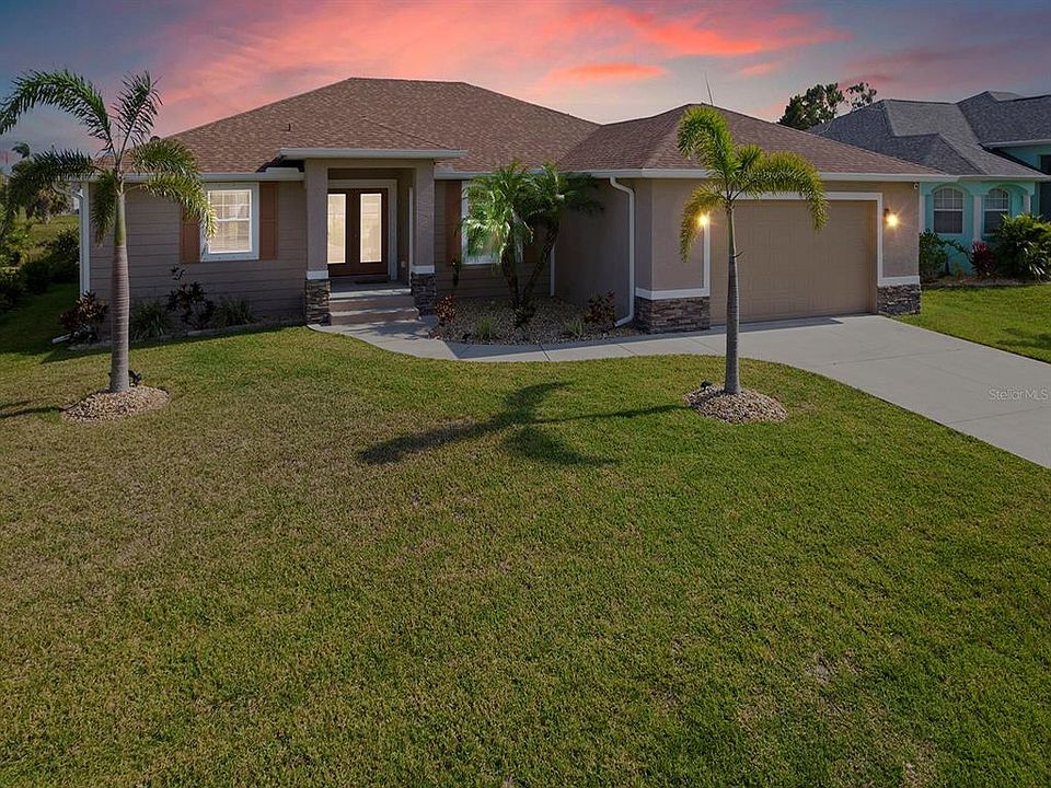 One or more photo(s) has been virtually staged. WELCOME HOME!! This 2016 build is absolutely immaculate! WATERFRONT, POOL HOME located in the upscale community of ROTONDA WEST - LONG MEADOW. This Beautiful 2037 sq.ft home features peaceful WATER VIEWS from almost every room, 3 spacious Bedrooms, PLUS.... BONUS DEN/OFFICE and 2 Full Baths. The GREAT ROOM has an OPEN concept design with cathedral ceiling and sliders leading to an over-sized lanai. The Beautiful Kitchen features granite counters, tile backsplash, STAINLESS STEEL appliances, beautiful cabinetry and a granite bar with seating. Other features include Large Den/Office, SPLIT BEDROOMS, Laundry Room, lanai with pavers and an over-sized Garage with enough room to store your boat. The Master suite features His and Her Closets, a tray ceiling, sliders to lanai, GORGEOUS tiled walk-in shower, and dual vanities. The guest bedrooms are very spacious, with large closets. The 2nd bath has a tiled walk-in shower and large granite top vanity. If you like to entertain, you will LOVE the SPACIOUS LANAI and patio area with 2 sitting areas, pavers throughout, and a HEATED SALT WATER POOL/SPA with an automated pool system and water view. The home is nicely landscaped with an irrigation system that is fed from the canal to save you money on water. A New Hot Water Heater was installed in 2018, NEW GUTTERS, NEW pool cage screens and a NEW ROOF DECEMBER 2022. This gorgeous home is less than 8 miles from BOCA GRANDE beaches, world class fishing, marinas, shopping and GREAT restaurants. Rotonda West offers several PARKS, PET FRIENDLY WALKING PATHS, BIKE PATHS, miles of canals and 5 GOLF COURSES. Furnishings are optional with a separate agreement. *PLEASE VIEW THE 3D TOUR AND VIDEO*