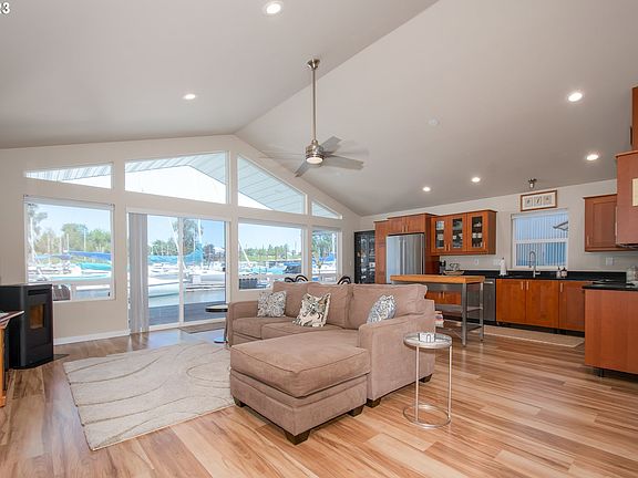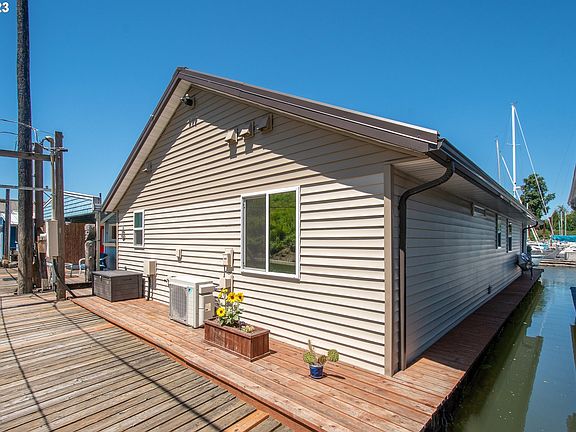 One owner floating home designed and built by Derek Morell Construction. Spacious open floor plan (think Great Room) with pellet stove for those Oregon winters. This floating home has 2 spacious bedrooms, 2 full bathrooms, separate utility room, stand up attic for storage with pull down ladder access. Exterior racks are installed for your SUP and other water toys. A sturdy swim ladder is also installed. The seller has added everything you need to move in and enjoy being 'lucky enough to llive on the river'. Open covered deck with room for a dining set, outdoor fireplace, lounge chairs. Privacy screen on the sides. Large safe in priimary walk in closet. The primary bedroom has an en suite bathroom plus walk in closet and room for bedroom furniture + chair & dresser. This floating home has been meticulously maintained and is move in ready. Carpet in bedrooms, ceiling fan in great room, includes washer * dryer. 2 parking spaces S & T