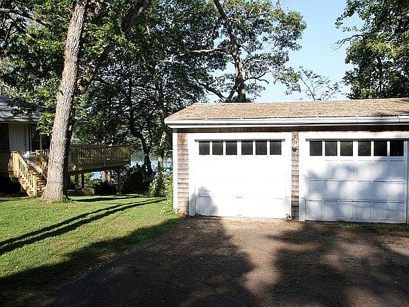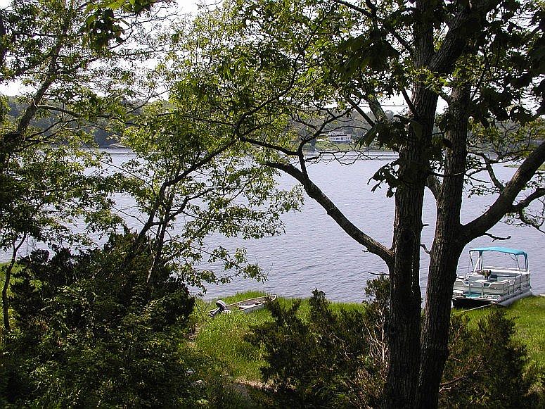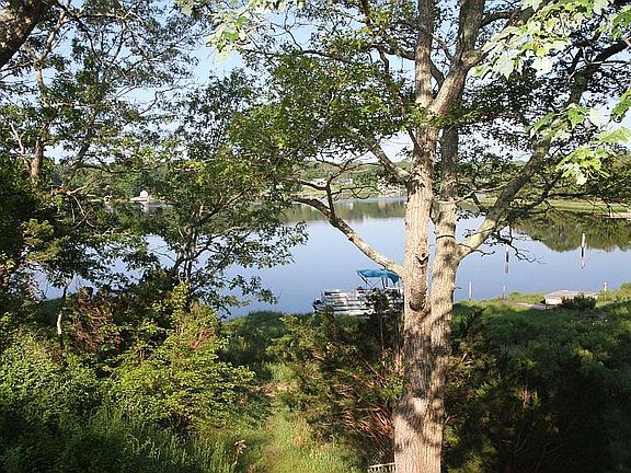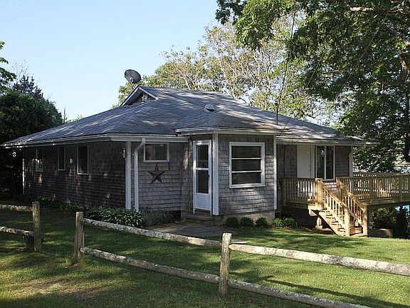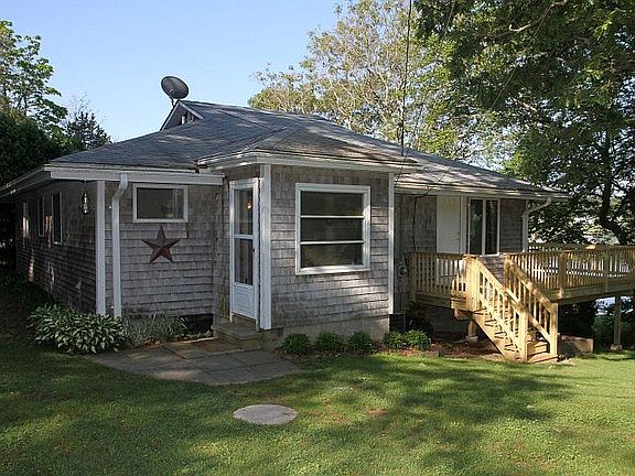 WATERFRONT on desirable CADMAN'S NECK! 2-3 BR, 1 1/2 BA Ranch on gently sloping lot to river enjoys East Branch waterviews, southwesterly breezes & incredible sunsets! Experience peace & tranquility from recent deck perched above the water. Interior boasts A/C, new Kitchen in 2009 w/soapstone counters, cozy Living Room w/brick fireplace, Dining Room w/pegged pine floor. Separate 2-car Garage. Neighborhood offers use of tennis court, area to launch boats. Vineyard nearby, and not far from Central Village, marina, and fabulous ocean beaches!