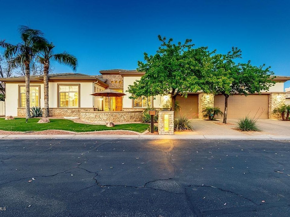 Exceptional custom basement home in the historic gated community of San Marcos Country Club! Architectural beauty inside and out. You will love the unique, gourmet chef's kitchen w/Viking gas range, double oven, granite counters, knotty alder cabinets, huge walk-in pantry, and a fabulous wrap around breakfast bar that opens to the great room. The split master retreat, with an exit to the back patio, boasts a two-way fireplace and a completely remodeled bathroom. Bathroom updates include natural wood accents, oversized walk-in shower, free standing tub, an amazing custom sauna, dual sinks and a spacious walk-in closet. Two more upstairs bedrooms are generous in size; one of which has a separate front courtyard entry. Both upstairs bedrooms share a completely remodeled bathroom. A dining room, large laundry room and a separate office round out the main level. The basement has two bedrooms, full remodeled bathroom, additional laundry room, and living area with a fridge and sink. The oversized 4 car garage has floor-to-ceiling cabinets and an additional rear garage door that opens to the back yard. The back yard is an entertainer's paradise with a recently remodeled pool with water feature, built-in BBQ, lush landscaping, misting system and multiple areas for entertaining! Recent updates also include new HVAC systems! The home, along with your neighbors on the street, are literally surrounded by the oldest golf course in Arizona, The San Marcos Golf Resort. This unique custom neighborhood is located right in the heart of Downtown Chandler. A quick walk through the back gate of the neighborhood takes you right into Downtown Chandler! This home is an absolute must see!