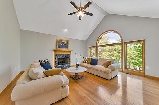 - Liv Dscrp: Fireplace, Flooring - Hardwood, Ceiling - Cathedral, Ceiling Fan(s), Window(s) - Picture
