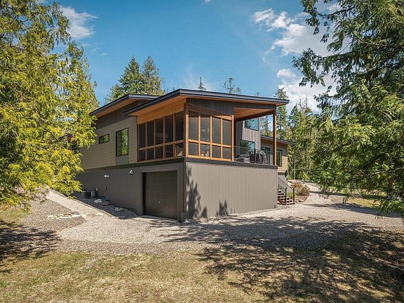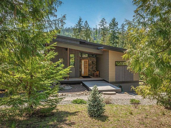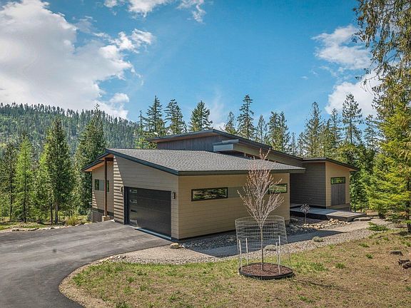 Mountain Modern masterpiece with architecture that blurs the lines of interior living spaces and the wilderness it sits amongst. With careful planning between the architect and homeowners, they were able to precisely place windows and doors to capture the long range mountain views. This stunning home sits on 4.29 acres, is located at the end of the road in the highly desirable Canyon Creek Ranch development and is surrounded on three sides by the 40 acre green belt. Three well appointed bedrooms and two spectacular bathrooms were designed for this living space. Gourmet kitchen with stainless appliances, double oven, pantry, quartz counters and luxe custom soft close cabinets. Enjoy waking up to seasonally changing mountain views from the picture window in the private master bedroom with en suite. Walk-in California Closet build, double sinks set in quartz, soaker tub, bidet, tastefully tiled shower with a view- Almost feels like you are showering outside. Open floor plan design in the main living area has floor to ceiling windows that flood the home in natural light. Built in fireplace and unique lighting adds to the ambiance. Floating wood staircase leads you to the loft which is the perfect office sanctuary. The two other bedrooms have tall ceilings, large closets, one of which has built-ins and windows that have outstanding views. The bathroom that they share has double sinks set in quartz, luxe custom cabinets and private tiled wet room with transom window. Home is sided in barn wood, hardi-plank and corrugated metal. Covered deck is plumbed with gas and has an attached screened in sitting area for summer dining with out pests. Extensive hardscape is artistically designed and flows around the home. Double garage, shop storage and a large utility room surrounded by spray foam insulation under the home. Seller cut a trail system through the property with numerous areas for reflection and serenity as well as a platform and firepit. Seller's trail connects to the green space trail system. 60 GPM well, two water heaters and separate elec. panel for generator attachment. The perfect location for recreation as the home is so close to Garfield Bay, Green Bay and Bottle Bay for boat launch, clear pebble beaches and lake fun. Minutes from downtown Sandpoint, Schweitzer Mountain and easy access to CDA. This mountain oasis with a paved road to it's garage is ready to be experienced.
