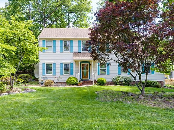 Price improved!!! Nestled in the middle of a fantastic wooded half acre home site in the heart of Midlothian this 5 bed/3 full bath Colonial invites you home!Upon entering you will find a foyer w/crown molding,custom built closets,chandelier & wood floors!Next is a rare first floor bedroom & full bath!The elegant living room boasts wood flooring & two windows offering lots of light!The dining room draws a crowd w/crown & chair rail molding,chandelier,two windows, & well kept wood floors.The kitchen has new laminate floors, stainless steel appliances,built in microwave,a wall of custom cabinets & pantry!Even an eat-in area within the kitchen!The family room boasts a gas fireplace with brick hearth and surround, ceiling fan, recessed lighting, and coat closet.The Florida room addition includes skylights,new ceiling fan,extensive built in bookshelves & a door to access the back yard!The beauty of the first floor are the three living areas for everyone to enjoy!Upstairs there are four generous sized bedrooms.The owner's suite is very spacious & includes a walk in closet & full bath!One bedroom has a room attached w/custom closets which could be a workout/office!Even a walk up attic!