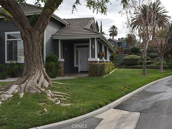 The home has carpet in both living areas and vinyl plank flooring throughout the entrance, hallways and bedrooms. All bedrooms have brand new paint and the entire home features upgraded baseboards, crown molding, plantation shutters and ceiling fans throughout. All bathrooms contain handicap rails for shower and toilet areas for ease of access. Master bathroom features walk-in-shower, a large jetted tub, double sinks, and a large walk-in closet. The master bedroom contains easy access to the backyard through the sliding glass door. Front entrance, back patio and garage are tiled for a very clean look. The back patio contains a gas valve to allow for an easy connection to a barbecue and a great slatted patio cover to provide the perfect complement of shade and sun. The kitchen opens up to the high ceiling family room, brightly lit by windows and a sliding glass door with a gas fireplace ready to entertain. Both patio doors lead to the private & easily maintained back yard with 2 plum trees. This home has been well loved and maintained over the years.