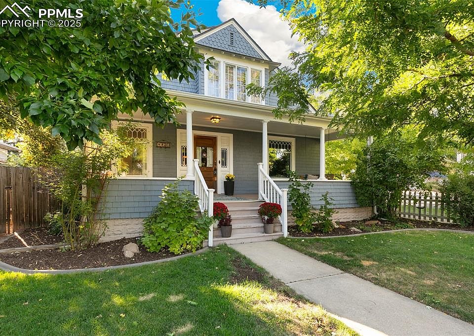 Welcome to a rare find in the heart of the Old North End. This turn-of-the-century home has been lovingly maintained, blending historic charm with modern comfort. Original wood trim, pocket doors, sunlit windows, and cozy gathering spaces give the home its character, while updates like central air, remodeled baths, and an oversized two-car garage add everyday convenience. The kitchen is bright and inviting with granite countertops, stainless steel appliances, a tile backsplash, and abundant storage—including the original butler’s pantry. A cheerful dining nook with room for a full-sized table opens through French doors to a spacious back deck, perfect for al fresco dining and entertaining. Inside, the living room features a welcoming gas fireplace, and the flexible dining room can serve as an office, playroom, or creative retreat. Upstairs, the owner’s suite offers an adjoining bath and closet, while two additional bedrooms include a whimsical “secret room” for play or hobbies. A second updated bath blends modern style with period charm, and a window seat on the sunlit stair landing provides a cozy place to pause. Outside, the white picket fence, perennial landscaping, and garden beds create a welcoming yard, with the original horse hitching post preserved as a nod to history. Just a short walk to Colorado College, downtown restaurants, shops, and events, this home offers the best of Colorado Springs living—a place where history, comfort, and community meet.