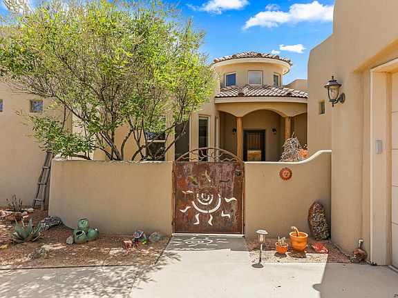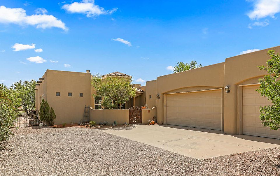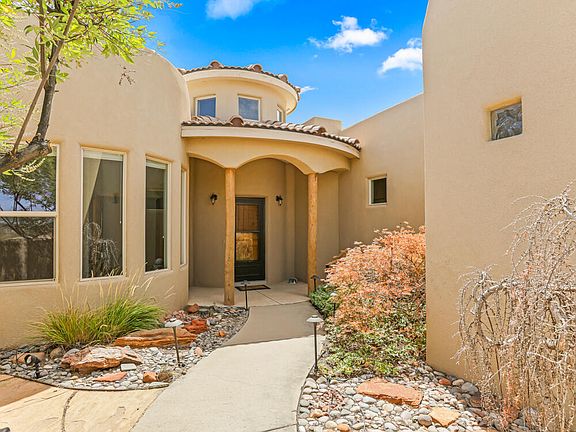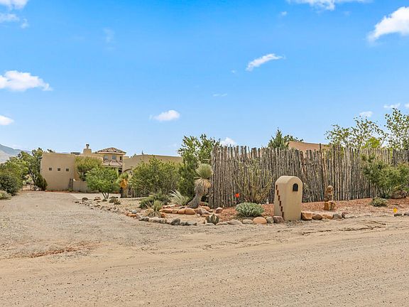 STUNNING SANDIA VIEWS! 3bd + office home with SW flair with T&G ceiling, Vigas & lighted nichos. Gorgeous hardwood floors in LR & office sets off the tile entry, kitchen & hallways. VIEWS of Sandias from IN & OUT side the home. Landscaped rear yard with large pond fed with waterfall all enclosed w/in a courtyard. A huge primary suite with long, dual sinked vanity, tiled snail shower and relaxing jetted tub. Lrg WIC has glass block details. Guestrooms are on opposite side of home, sharing a JacknJill bath. Major updates include: TPO roof (2021), 2 Combo AC/Furn units replaced (2023) & new well pump(2025). Back portion of lot is fenced to protect the garden. Seller left a handy composter too. 3 car finished garage. Comfortable & beautiful with million $$$ views. Experience it TODAY!