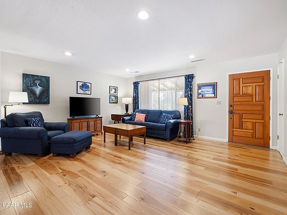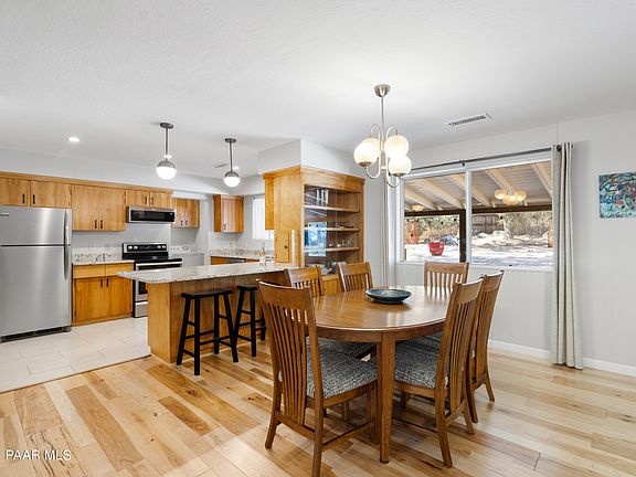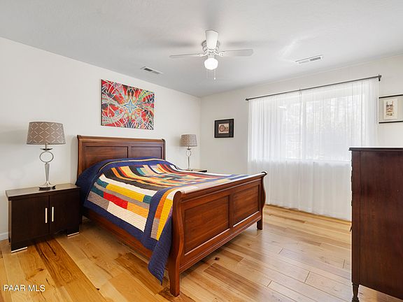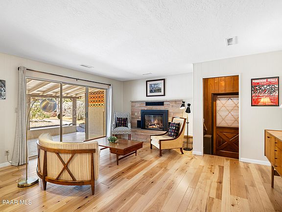 Pristine midcentury modern 3/2 gem in the tall pines offering modern upgrades and amenties while preserving original character and period details. Room to park RV and no HOA! Close to historic downtown Prescott just across the street from Stricklin Park featuring a seasonal creek and connection to National Forest trails. Open concept living with rich hickory flooring throughout; kitchen with high-end granite counters, new stainless appliances, tile floor and original cabinetry; spacious living, dining and family areas that open to the covered patio running the length of the house; baths with new tile floors, walk-in shower in primary and stunning crushed stone vanity tops; large bonus room with new carpeting. Large usable yard with fenced dog run or garden area, rustic decorative fencing