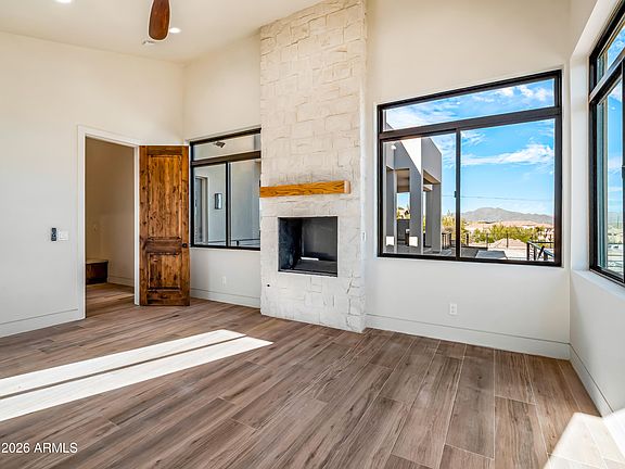 This exceptional property is a dream come true for car collectors and entrepreneurs alike, offering an extraordinary blend of living, garage, office, and shop space. Scheduled for completion in February 2026, the estate features three separate buildings with a total of 9,597 square feet under roof: a main residence, a guest house, and a detached garage with shop. The main home includes a 3-car attached garage, while the 3,147-square-foot detached garage/shop can accommodate 3 to 8 vehicles, making it ideal for collectors, hobbyists, or business owners. Located in a no-HOA area of Phoenix, this 3,272-square-foot meticulously crafted residence offers 3 bedrooms and 2.5 baths on a 1.265-acre premium lot with breathtaking mountain, sunrise, and city-light views. The thoughtfully designed split-floor plan places the primary suite on the south side of the home and two additional bedrooms on the north. High ceilings, expansive windows, and large glass doors flood the interior with natural light, creating a bright and open atmosphere throughout. The private backyard is a true retreat, featuring low-maintenance desert landscaping, a heated play pool with spa, and multiple outdoor seating areas perfect for relaxing or entertaining. The 556-square-foot guest house is fully self-sufficient for short- or long-term stays and is built with the same high-end materials and finishes as the main residence. A rare and remarkable opportunity to own a one-of-a-kind desert estate designed for luxury, lifestyle, and versatility.