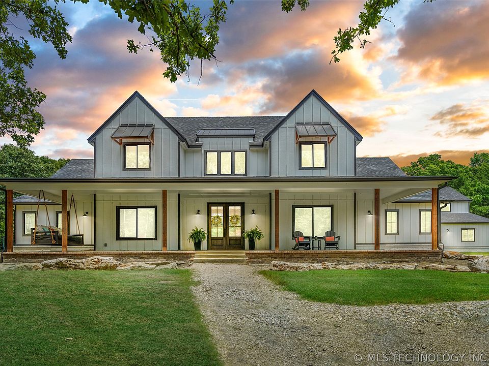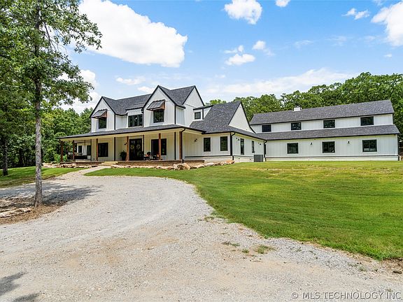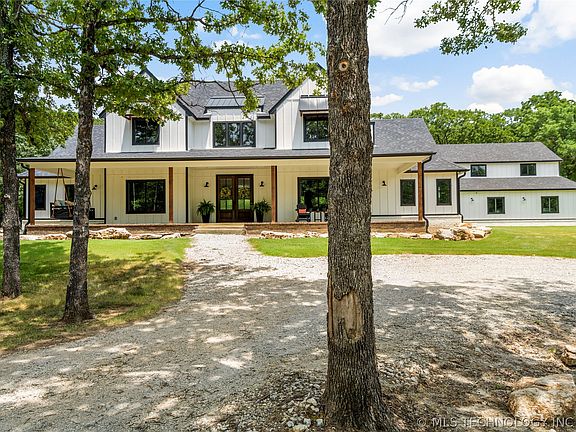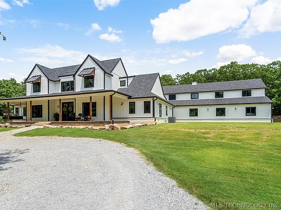 A nature lover's paradise on 15 wooded acres in Bixby schools! Drive up to your modern farmhouse, complete with a charming front porch spanning the front facade, perfect for relaxing and enjoying the serene surroundings,. This newer construction boasts 5 spacious bedrooms including a loft, 4 full baths, man cave, and an array of unique amenities. Enter the open living space with large sliding glass doors, vaulted and beamed ceiling, and fireplace flanked with floating shelves. Enjoy culinary delights in the expansive quartz kitchen with a 10x6-foot island + breakfast nook, perfect for family gatherings. Step into the inviting man cave, featuring a stunning 26-foot stone wood-burning fireplace, reclaimed wood walls, a rustic barn metal ceiling, and a live edge drink rail. Also included is dedicated hobby closets for all your creative endeavors. Custom handmade rustic barn doors add to the charm throughout the house. The home is designed for ultimate efficiency with spray foam insulation. The garage closet is prepped and ready for a walk-in cooler. The property is equipped with tight-lined gutters, satellite, fiber internet, and a security system. Outside you can indulge in gardening, fish in the pond, or relax in the tranquility of your private oasis. Enjoy the evenings on your covered back patio areas, soak up the sounds of nature or watch the deer passing through!