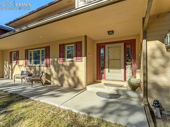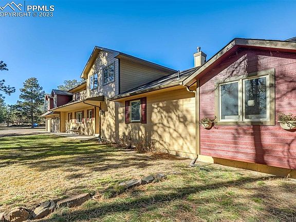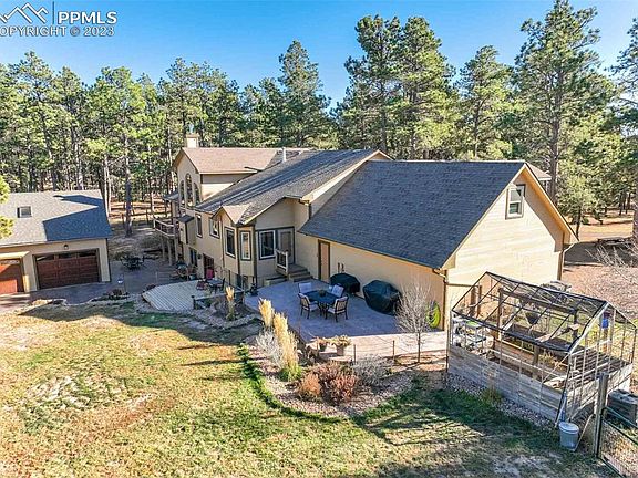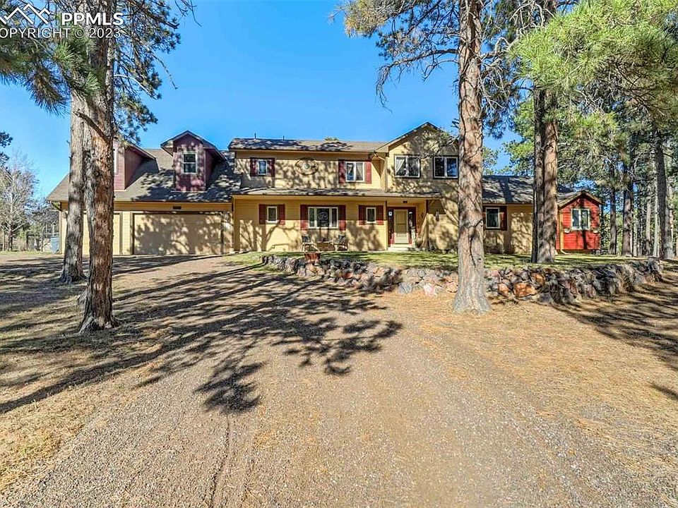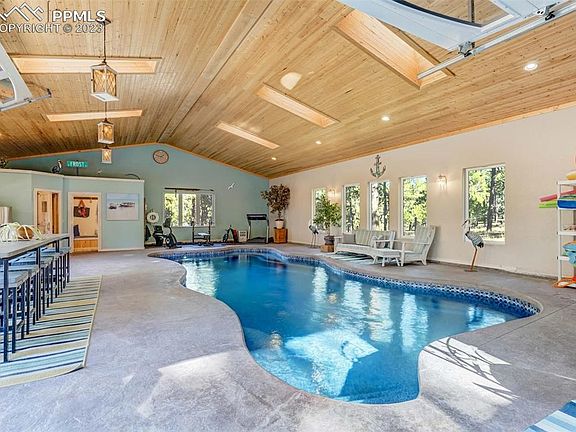 This home, located in the desirable Black Forest, includes a private pool house with a custom dressing area and sauna, six skylights, triple garage doors and 35 ft heated pool for year-round enjoyment. Situated on 10 acres of wooded forest, this nearly 5,000 sqft home presents a formal foyer leading into the expansive living room which features an eye-catching stone fireplace, plenty of natural light, and built-in bookshelves. The gourmet kitchen hosts an island breakfast bar with a built-in microwave oven and gas range, double oven, desk area, eat-in dining area, and walk-out access to the open patio. The spacious owner's suite includes a beautiful 5-piece bath, walk-in shower with dual heads, garden tub, and large walk-in closet. The loft overlooking the living and kitchen area features an office, cozy library with built-ins, reading area, beautiful bedroom over the three- car garage, and full bathroom. The basement includes a wood-burning stove surrounded by a beautiful stone wall, an inviting wet-bar, entertainment center, two bedrooms, two bathrooms, ample storage space, and walk-out access. The shed closest to the home is perfect for garden storage. The 1440 sqft barn with loft can be used for additional parking. There is dog-run access through the 3-car attached garage. Special features include underground fiber optic, RV hook-up and parking, whole-home humidifier, two furnaces, two hot water heaters, and water softener/ filtration system. Don't miss your chance to own this spectacular Colorado dream home nestled in Black Forest!