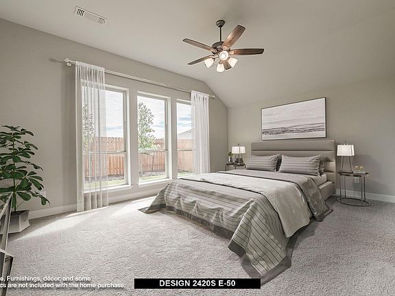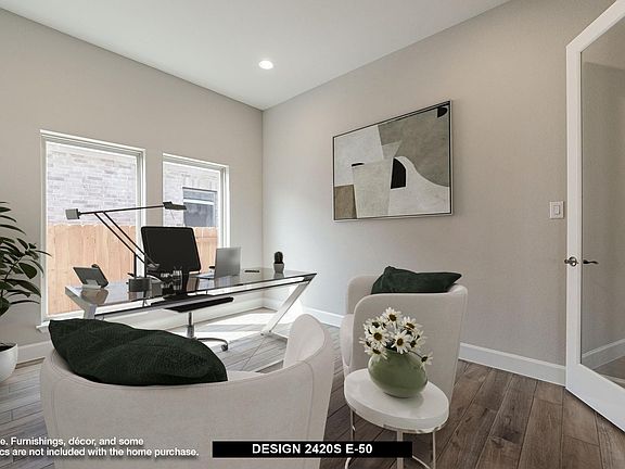 Entry welcomes with 12-foot ceiling. Home office with French doors off extended entry. Spacious family room with wall of windows opens to kitchen and morning area. Kitchen offers walk-in pantry, a 5-burner gas cooktop and generous island with built-in seating space. Private primary suite. Dual vanities, corner garden tub, separate glass-enclosed shower and large walk-in closet in primary bath. Secondary bedrooms plus a guest suite complete this open one-story design. Covered backyard patio. Mud room off three-car garage.