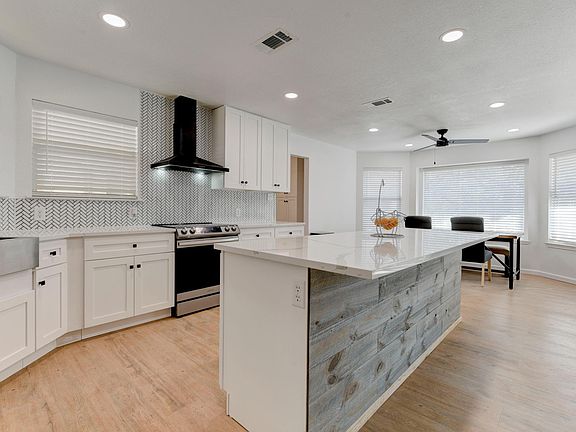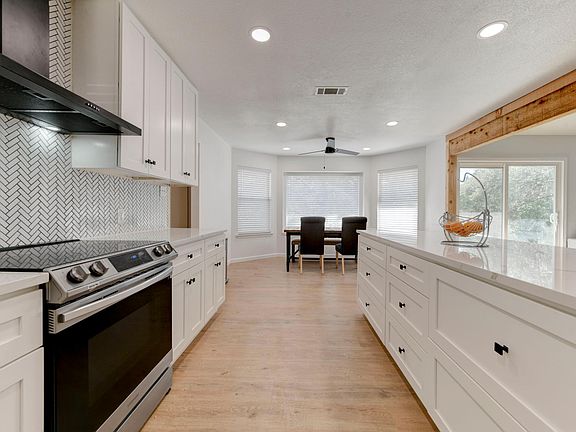 A beautifully remodeled 3 bed/2 bath LAKE HOUSE in Lago Vista that sits on a 1 acre lot! Walk out into the lake from the backyard! This home comes fully FURNISHED, ready to move in. It has an open floor plan with beautiful flooring throughout, VAULTED ceilings, an abundance of natural light, and a brand new FIREPLACE. The SPACIOUS kitchen opens up to the living room and dining area. It is fully loaded with stainless steel kitchen appliances, including a French Door refrigerator, electric stove, sleek vent, farm house sink, and dishwasher. A big, CUSTOM kitchen island gives you plenty of prep space, use as a breakfast area, or have friends and family gather around while cooking. The pantry room is right next to the kitchen and has more than enough storage with floor to ceiling cabinets. The laundry room has a brand new front load washer and dryer. The living room has HIGH ceilings featuring all natural CEDAR BEAMS. It has an oversized, super comfortable sectional couch and an equally large, cozy bean bag. The entertainment space features a flat screen tv, custom-built mantle, and an electric fireplace. This space is centered in the middle of the living room and can be viewed from the kitchen. The main bedroom has a king size bed with a wooden BARN DOOR leading to the main bath. The main bath is stunning with a shower accented by copper/brushed gold penny tiles, DUAL shower heads and spa like BODY SPRAYS. It has a custom vanity with dual sinks, accented by gold brushed faucets, recessed mirrors with rustic and moody lighting. Right off the bathroom is a walk-in closet with a built-in closet system and shoe rack to organize your wardrobe. There are 2 additional rooms in the house which can serve as a guest room and/or an office. The guest room has a queen size bed and closet. The office has a versatile STANDING desk, a TREADMILL, and a file cabinet. The guest bath is beautifully renovated with a deep blue vanity with BRUSHED GOLD accents and a unique porthole mirror. The tub/shower area is highlighted by the same copper/brushed gold penny tiles as the main bath. The expansive backyard is full of trees providing a peaceful, quiet and private OASIS. Nestled underneath an oak tree is a hammock for relaxing and reading out in nature. There is a Pergola for outdoor picnics and gatherings. One of the best parts of this house is walking down to the LAKE view from the backyard! It serene and calm given the house is situated on a cove. There is plenty of parking in this house with its 2 car garage, a separate car port, and a long driveway. Rent is $2,395/month, fully furnished! It is ready for move in starting Oct 8, 2022. This is great for a short term tenancy (3 months or month-to-month). Unfortunately, we can't allow pets in the house. Feel free to reach out through Zillow or call/text me if you're interested! Rent is $2,395/month fully furnished. A security deposit of $2,395 and first month's rent is required to move in. Utilities are separate (electric, trash, internet). Unfortunately, no pets and no smoking allowed. There is plenty of parking for 3 or more cars.