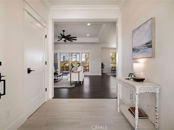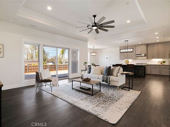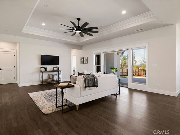 This well-designed 1,795 square foot home on .31 acre lot has 2 bedrooms, 2 bathrooms, a large office/den, and is situated on a quiet private cul-de-sac. Enjoy a sky that colors with sunrises, sunsets, full moon rises and bright night stars in summertime. Step inside through the formal entry to the open floor plan with separate dining area next to kitchen. The living room features a 10-foot tray ceiling, and double doors to the large den create an even more expansive space. Beautiful crown molding in most rooms in the home. An abundance of windows bathe the home with natural light. The kitchen features quartz countertops and backsplashes, beautiful stainless appliances including refrigerator, a large island, pantry, and plentiful cabinet space. Upgraded cabinets have soft-close doors and drawers, roll out shelves, and under cabinet lighting. Adjacent to kitchen is a supplementary storage and workspace in the hallway across from the spacious laundry room. The primary suite has a side-door to the patio and boasts an ensuite bathroom with two vanities, a spacious walk-in shower, and walk-in closet. The oversized two-car garage has space for a workshop or storage in addition to accommodating two large vehicles. Fenced on three sides with low maintenance front yard, large concrete patio in back, and RV parking, this lightly-lived-in home could be your serene retreat in Paradise.