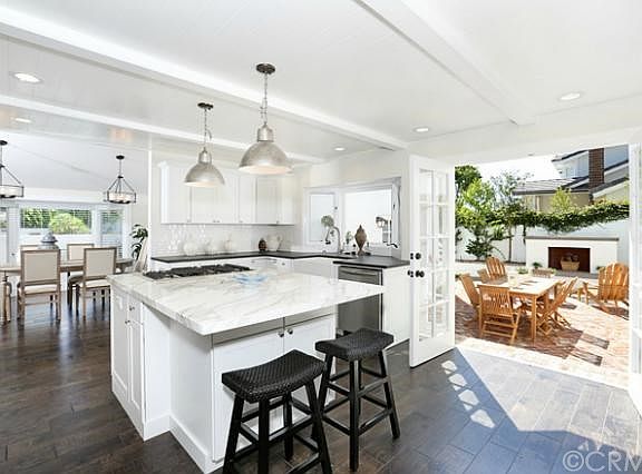 This stunning and spacious home has been completely remodeled and shows like a model. Boasting 5 bedrooms and 3 1/2 baths, the property is sure to appeal to those with the most discriminating taste. Ideally located on a coveted cul-de-sac within the premier family neighborhood of Harbor View Homes, the entrance to the property offers an enclosed front yard complete with white picket fence and charming front porch. Once inside, you immediately are greeted with an open and bright floor plan. Vaulted ceilings and distressed hardwood floors run throughout the entire property. A gourmet kitchen with custom cabinetry, marble countertops and stainless steel appliances opens to both the back yard and the large family room with used brick fireplace. The lower level offers a generous bedroom suite with custom built-in cabinetry. Outside is a charming used brick patio and outdoor fireplace which is ideal for enjoying the Newport Beach climate. Upstairs is an oversized master retreat complete with a large office area and sitting room, luxurious master bath with dual vanities, a soaking tub and 2 large walk-in closets. 3 additional bedrooms and 1 guest bath complete the second level of the home.
