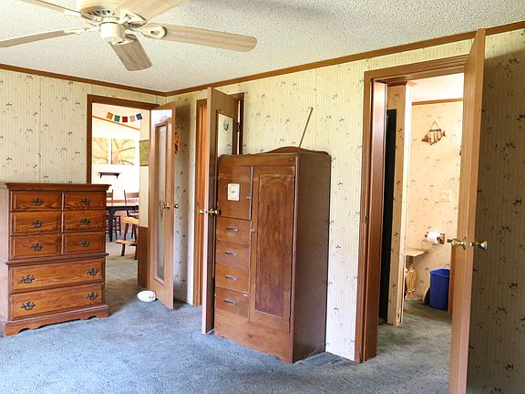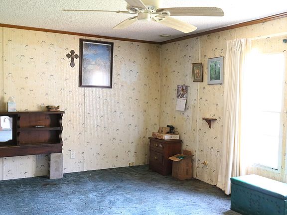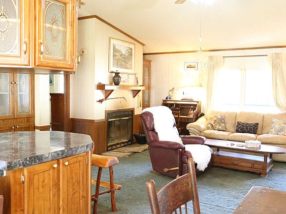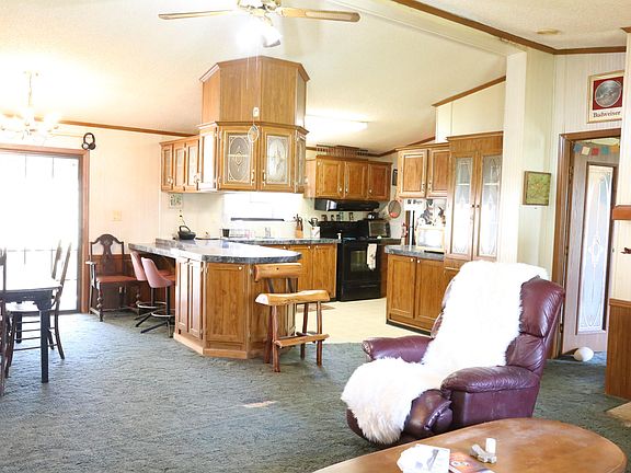 Doublewide manufactured home with 3 bedrooms and 2 bathrooms situated on 3 acres with a private, secluded feel. Home features an open floor plan with combined kitchen, dining and living rooms, a laundry room off the kitchen, primary bedroom with ensuite bathroom and walk in closet off the living room, and the other two bedrooms with walk in closets and the other bathroom off the opposite side of the living room. The back yard is fenced and has a storage shed and detached rv carport and garage. Metal roof is a few years old.