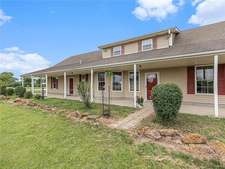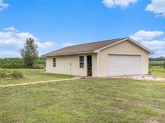 NO HOA-Your own 5-acre country oasis with the most amazing front porch that expands the entire front facade, pointed toward the east for capturing gorgeous morning sunrises and plenty of afternoon & evening shade. In-laws, extended stay guests, kids returning home and most importantly, you, will love the separate living quarters connected to the main house with its very own private entrance from the front porch and access into the garage. This space is complimented with a full bath, bedroom, kitchen, living room with a fireplace. Yet, there is still plenty of room inside the main house featuring 3 bedrooms on the main floor, including the primary with separate shower and tub ensuite and a super convenient laundry room right outside the main floor bedrooms. Center kitchen island opens to vaulted ceilings donning skylights in the family room. Upstairs loft, overlooking the family room, is spacious enough to cater to a kids playroom, tv area, or library/den. Another surprise awaits upstairs with an oversized 5th bedroom, office or hobby/craft room with private half bath inside and exterior access to the side yard overlooking the garden with a 2-car garage/outbuilding beyond that. Has electrical, a separate room for a workshop or storage and vinyl siding added in 2018. A small venture to the southwestern corner of the property, beyond the clustering of trees, a small pond eagerly welcomes visitors and rainfall alike. Located on the outskirts of Pleasant Hill and nearby Lake Winnebago but within minutes to everyday conveniences and a quick half hour to the KC Metro! Listing agent is related to sellers.