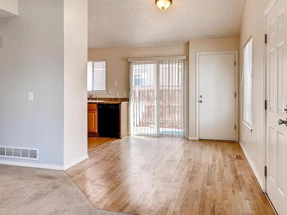 Ranch-style starter home in Cherry Creek School District puts homeownership within reach. Step through the charming gabled covered entry to the main living area, with soaring vaulted ceiling above and nice hardwoods below. Open floor plan connects living room with dining area and kitchen. Full suite of appliances lets you enjoy home-cooked meals from Day One. Sunny kitchen enjoys southern exposure and spacious 30 hardwood cabinets with display shelf below high ceiling. All bedrooms are carpeted. Full bath has tile floor, hardwood vanity, newer light fixture and hardware. Laundry room comes with stacking washer & dryer. Home is already cable-ready, and comes with window coverings, so getting set up doesnt require a bunch of additional expenses. Fenced backyard has sprinkler system and patio. Yard is big enough for kids, dogs, grill space and garden. Your housewarming BBQ can enjoy cool afternoon shade in backyard. Walk to park. Near public transit and retail.