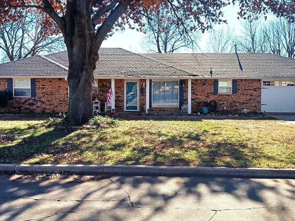 ENJOYABLE LIVING!! As you drive up to this home in Williams West Addition you will love the large tree in the front yard. The front porch is perfect for long naps or just relaxing! Indoors, you will be treated to granite counter tops in the kitchen which features a stainless steel oven, built-in microwave, & smooth top stove. Washing dishes will be enjoyable again as you look onto the front yard from the window above the stainless steel kitchen sink. An abundance of cabinets completes this kitchen!! The family room is accented with a beamed cathedral ceiling, wood burning fireplace & laminate floor. Double full glass doors lead to a covered patio & privacy fenced backyard w/ 3 raised garden beds! The 2 guest bedrooms are large. The hall bath is updated w/ a beautiful tiled shower & double sinks! The primary bedroom includes a walk-in closet & tiled bathtub/shower combination. New roof installed 2020, New gutters in 2021. Double hung double pane Low E vinyl windows are a GREAT BENEFIT! The gun safe stays! Schedule your appointment today to see this wonderful home by calling Ron @ 580-467-1281.
