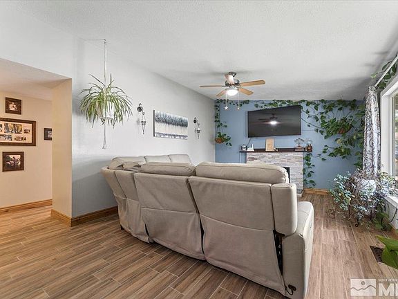 Welcome to your new home! This charming 1,415 sq ft home feels even more spacious inside. As you step through the front door, you're enter a cozy living room featuring a fireplace. The generously sized kitchen and dining room combo is ideal for gatherings and entertaining. All the bedrooms are nicely sized, with the primary bedroom offering a walk-in closet and an en-suite bathroom complete with a walk-in shower. The hall bathroom offers a relaxing bathtub. Most of the home features beautiful, wood-look tile flooring. Relax on the patio under the gazebo, which stays with the home. There's also a full chicken coop that can remain or be easily converted into a shed, adding versatile storage options. The side yard offers both turf and paver areas. The front yard, fully fenced, has a nectarine tree and low-maintenance artificial turf. The backyard is also fully fenced with artificial turf, while a designated area features real grass. Enjoy privacy and shade from surrounding trees. This home is conveniently located within walking distance to elementary, middle, and high schools, and is close to shopping and easy freeway access. Seller has tile to complete the floors that haven't been changed yet. Seller is a licensed real estate agent in the state of Nevada.