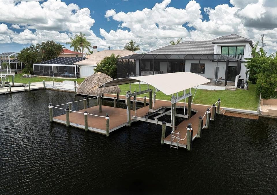 HUGE PRICE REDUCTION $ 4000,000.00, IT IS THE MOST REPRESENTATIVE VILLA… YOU CANNOT BEAT THIS….1 AAA LOCATION.. DESIGNED AND FULLY FURNISHED BY "LEILI" FOR $700,000,00, EXCLUSIVELY WITH HIGH-END DESIGNER FURNISHINGS. 2 MINUTES DIRECT ACCESS TO THE GULF.. NO BRIDGES. COMPLETELY DESIGNED BY "LEILI" USING ONLY HIGH END FURNITURE. With incredible attention to detail result in an unbeatable USP, built by "FREY AND SON" guaranteeing high end quality. New covered boat dock with a new lift build by "STOKES MARINE" with a very very large Tiki platform, of course equipped with electrical connections and water connection to optimally maintain your boat. A captain's walkway is provided with a special surface. Experience refined coastal luxury in this exceptional waterfront home, where exquisite craftsmanship and thoughtful design create a seamless blend of elegance, comfort, and indoor-outdoor living. This residence boasts a stylish oversized adventure Pool with privat Spa with tranquil waterfall. Surrounded by lush, meticulously landscaped grounds that enhance both privacy and beauty. The oversized lanai serves as a true outdoor retreat, featuring a welcoming dining area and a spacious professional outdoor kitchen with Coyote Grill, Flame, extractor hood, wine fridge and air-conditioned drawers, designer outdoor bar chairs. Dining table area outside luxurious seating making it ideal for both quiet mornings and great parties with your friends at night. Disappearing sliders doors connect the great room to the outdoors, creating a harmonious transition between interior and exterior living spaces. Inside, the kitchen offers elegant cabinetry, sleek granite countertops, stainless steel appliances, and a spacious granite island. A charming dining area overlooks the pool, the lanai and the Water, adding to the home's inviting ambiance. A walk-in pantry provides additional storage and functionality. The open-concept design ensures a natural flow between the kitchen, dining area, and great room, where designer lighting and elegant finishes add a touch of sophistication. The office provides a quiet ambience for relaxed work, if you want. The primary suite is a private sanctuary, featuring walk-in closet and a spa-inspired bath with a luxurious shower, deep soaking designer tub, and dual vanities. A glass-paned door opens directly to the lanai, allowing for effortless indoor-outdoor living. A spacious three-car garage with built-in storage provides ample space for vehicles and equipment. This home is truly turnkey—FULLY FURNISHED and ready to move in, not forgetting the professionally furnished private fitness room equipped with the best sporting equipment. And also not to forget a special feature: all windows are blackout with custom-made blinds from "Hunter Douglas" and are individually electrically adjustable. They not only ensure your privacy but also protect you from excessive sunlight. For your safety, the entire lanai features a hurricane-proof electric screen, which is also operated by remote control. Pure comfort, unbeatable. of course hurricane-resistant glass is used for windows and doors. Conveniently located just minutes from world-renowned beaches and many championship golf courses, as well as many restaurants and the finest shopping. Simply unlock the door and start living in paradise. Everything is there; you don't need to organize anything.