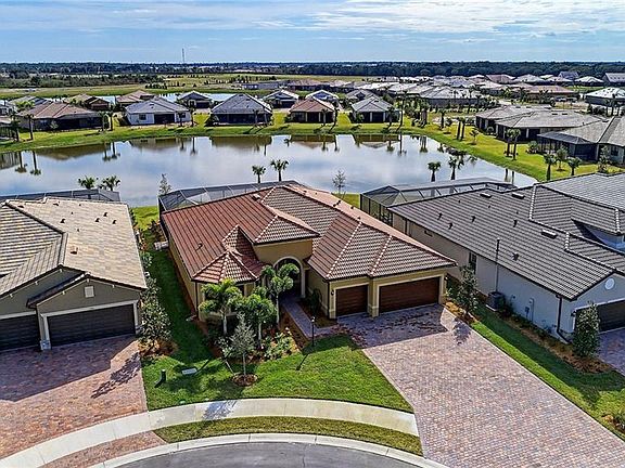 BETTER THAN NEW. Highly desirable Del Webb Pinnacle with premium cul de sac waterfront lot. Why wait for new construction? 3 bedrooms, 3 full baths, 2488 square feet on one level, with numerous luxury and accessibility design updates. A stunningly beautiful kitchen features quartz counters, an expansive island, stainless steel KitchenAid appliances, tons of storage in off-white, premium cabinets with pull out drawers, cabinet crown, and under-cabinet lighting. An open floorplan with disappearing corner sliders, built-in surround sound, top of the line tile in the living areas and carpet in the bedrooms. Upgrades include heated salt-water pool and extended lanai cage, outdoor kitchen and entertainment prep, coffered master ceiling, professionally built out master closet, crown molding, laundry room cabinets, extended garage with premium epoxy garage flooring, professional cabinets, tankless water heater, 60' paver driveway, and Ring video doorbell. Premium LED lighting and ceiling fans throughout with wall mounts and prep for 3 LED TVs. Accessibility upgrades include zero entry master shower, custom vanity, expanded hallway entrance, lanai railing, and bath/shower grab bars. Del Webb amenities include stunning heated pool, spa, clay tennis courts, pickle ball, bocce ball, incredible lounge areas, game rooms, exercise facilities, restaurant and bar. See it today and you may never want to leave.