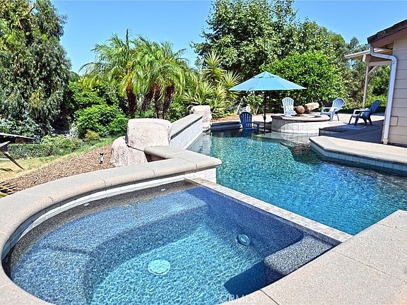 Wonderful opportunity to own a single level end of culdesac home on a massive 17,950 square foot lot. This beautiful property offers 2,232 living square feet including 3 bedrooms plus an office and 2 bathrooms and features numerous fabulous upgrades and amenities including: an open kitchen with large island, granite countertops, tile backsplash, built in fridge, double oven adjacent to the dining room with cathedral ceilings, chandelier, fireplace with gas logs, step into spacious family and living rooms, other property amenities include double paned vinyl windows & sliders and blinds, concrete tile roof, skylights, coffered ceilings, crown molding, mirrored wardrobe closet doors, hardwood and tile flooring, newer HVAC and roof, solid wood custom entry door, bathrooms feature newer fixtures & tile flooring, 2 car attached garage, an enterainters backyard complete with patio cover, pebble tec pool and spa with waterfalls, water features and firepit, large grassy area and planter boxes for gardening, association pool, no mello roos and award winning schools.