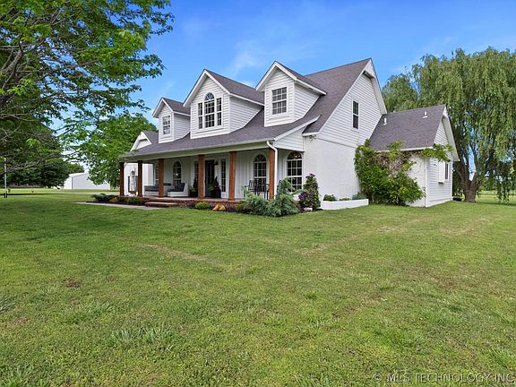 Charming country setting w/ mature trees & pasture, beautiful homes in the area, modern farmhouse home faces West for stunning front porch sunset views, features 3 bedrooms plus a study, large windows for lots of natural light, sunroom for 2nd living space, granite kitchen, gas range, outdoor fireplace, 40x40 shop w/ 220, concrete floor, front/back sliding garage doors, engine lift, stalls for horses or goats, chicken coop, pond, raised garden bed & potting shed, zoned Ag, 3 mi to new Bixby West School.