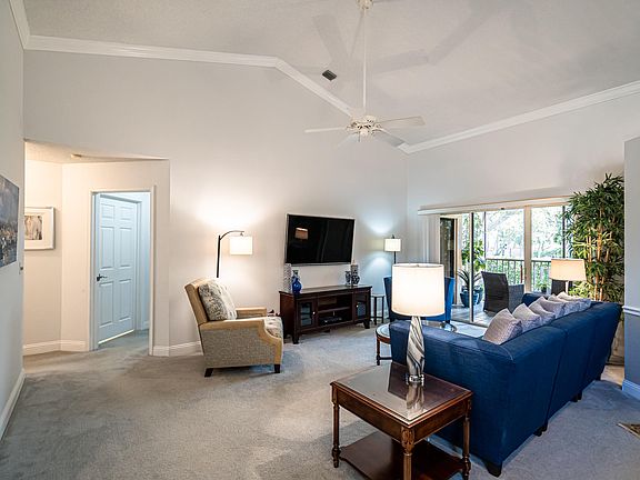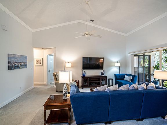 This meticulously kept and impeccable 3 bed, 2 bath coach house feels like home and shows like a model home. Conveniently located in the highly sought-after Boca Golf and Tennis Country Club, not a detail has been overlooked. Once inside you are greeted with glass French doors to the bedroom/den and a living room that is filled with natural light all the way up to the cathedral ceilings and skylights and accented by crown molding throughout. You'll pass into an open living room and ample sized dining room with wainscoting into a chef inspired kitchen with basket weave backsplash, stainless steel appliances, porcelain floors, 1 1/2'' granite, bullnose, counters, 42'' White custom cabinetry with nickel finished hardware and a custom, built in, matching table with views of the balcony and