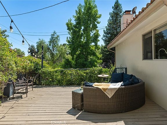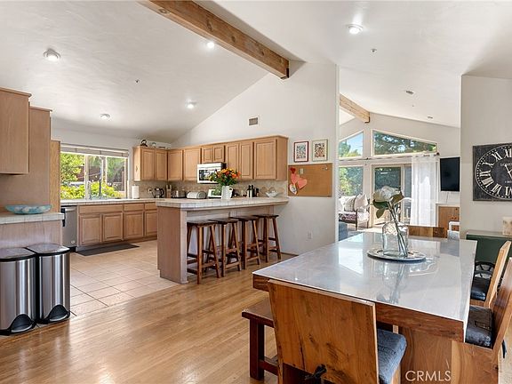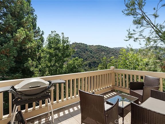Experience the best of Topanga living - a modern, mediterranean style 3 bedroom home nestled in the heart of the Canyon. Step inside and be immediately captivated by expansive windows that fill the space with natural light and frame stunning panoramic mountain views. Dramatic, beamed ceilings add a sense of grandeur, and a convenient powder room off the entry is perfect for guests. The open-concept kitchen and dining area, complete with a breakfast bar and newer appliances, flows effortlessly into the sun-drenched living room - ideal for entertaining or simply unwinding. The primary suite is located on the main floor and features a beautifully renovated ensuite bathroom with double vanities, a spacious soaking tub, and a high-pressure shower. A massive walk-in closet provides all the storage you need! Downstairs, you'll find two generously sized bedrooms that share a full bathroom with both a tub and shower. One of these bedrooms includes a large sleeping loft, and yes, there's even a fire pole! Enjoy more recent carpeting in all the bedrooms, and take full advantage of the expansive wraparound decks for dining al fresco or soaking in the serene canyon views. The garage has been smartly converted into a flexible space with a Murphy bed and office area, perfect for guests or working from home. With central heating and air conditioning, comfort is ensured year-round. Parking is plentiful, and nature lovers will be thrilled with trail access just a few minutes away, leading further into the breathtaking Santa Monica Mountains. Plus, you are just a short drive to the beach, valley shopping, and even within walking distance to one of the charming local cafes. Do not miss the chance to live the quintessential Topanga lifestyle in this unique and inviting home!