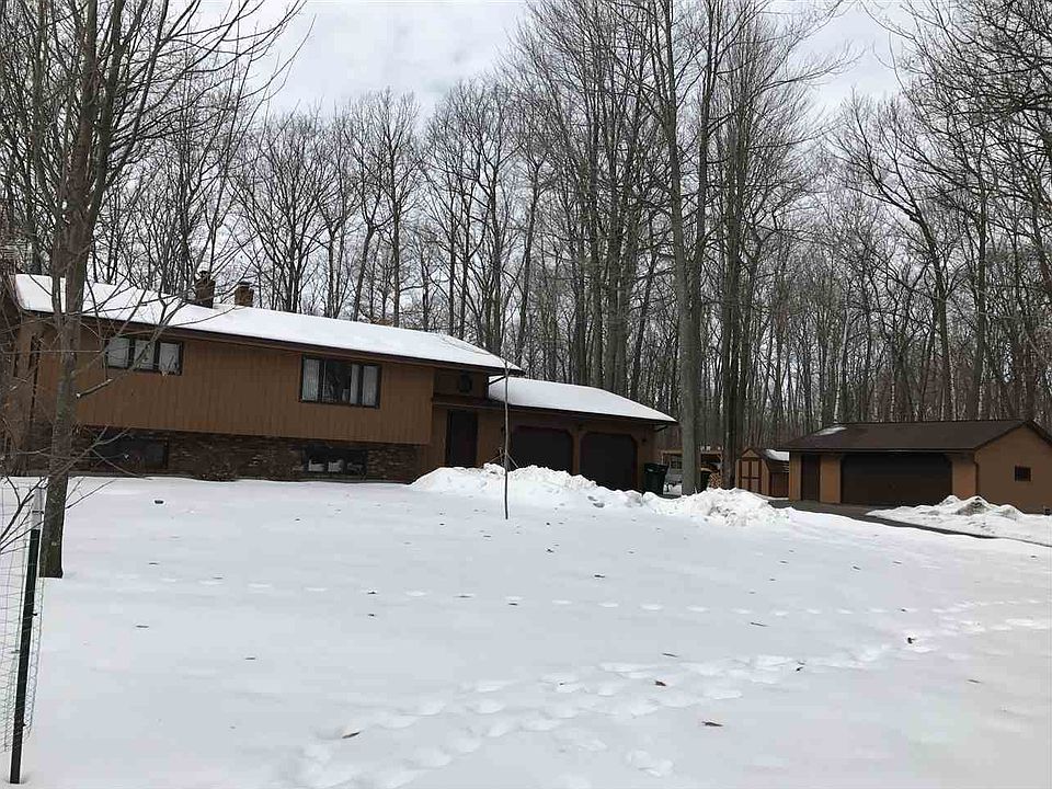 Meticulously maintained 4 bedroom, 2 bath home located on a beautiful 2 acre wooded lot. The main level includes an open concept living room, dining room and kitchen with nice sized pantry, 2 bedrooms and full bath. The lower level features a nice sized family room with lots of light and a wood burning stove, 2 bedrooms, bath, laundry room with laundry tub and plenty of storage. Stainless steel appliances are included as well as the window blinds.There is an attached heated 2 car garage and detached 2 car garage as well as a small storage shed. Two furnaces included in home, one is natural gas and the other is a wood burning furnace. Firewood next to garage is included. Very quiet neighborhood.