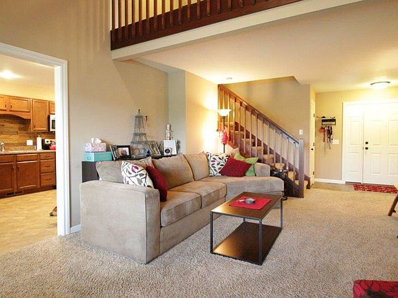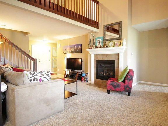 4 yr old Townhouse with a lofted ranch design on a Pond Lot. Predominantly main floor living with only a large loft and the 3rd bedroom upstairs. The total living space is a substantial 1744 Sq-ft. The main floor has the master bedroom, master bath, bedroom 2, full guest bath, the living room, a dining area, large kitchen, laundry room and a 2 car garage. The two main floor bedrooms are not adjacent to each other, they have a split bedroom arrangement with the guest bath and bedroom down a separate hallway. Gas log fireplace in the living room. Large kitchen with cedar back-splash and pantry closet. Master bath has double sinks, low-profile shower curb, garden tub and a large walk-in closet. There is a north facing covered patio with pretty pond views. Refrigerator, range, water softener, washer/dryer and blinds are included. Lawn and Snow is Optional: you can choose to handle you own mowing and snow removal or opt into the association organized services.