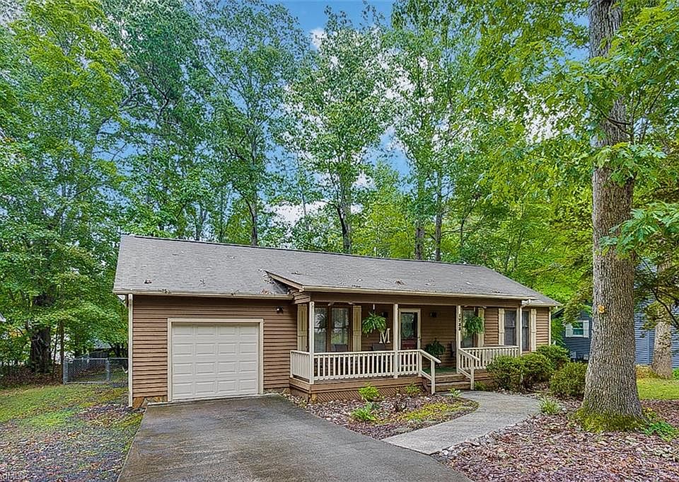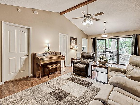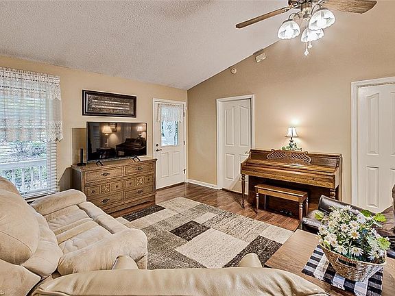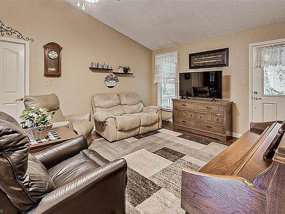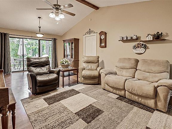 Charming well maintained home! Great room features vaulted ceiling & opens to the dining room. Nice eat-in kitchen with pantry & all stainless appliances remaining, including refrigerator. Laundry room has granite counter, storage cabinets/shelving & stackable washer/dryer remains. Both bedrooms feature an adjoining bath! Enjoy the evenings on the covered front porch or out back on the tiered deck overlooking the fenced in back yard! Great space for storage in the wired building with shed. Roof replaced on house & building in 2023. Single garage & paved drive. Fantastic location!