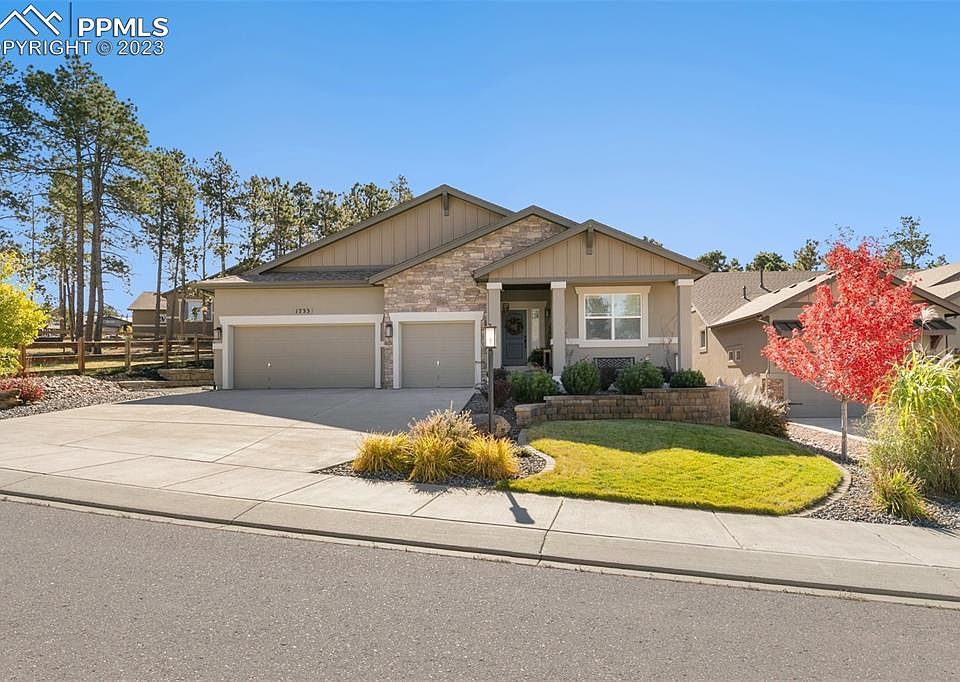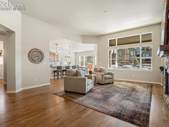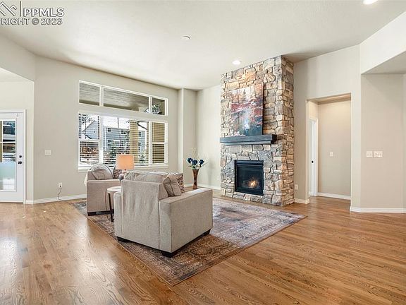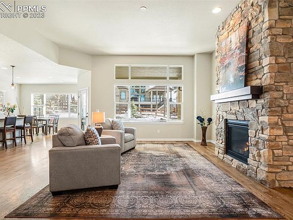 Stunning home situated on a cul-de-sac in Sanctuary Pointe. The welcoming foyer draws you into the great room featuring soaring ceilings, stone fireplace, and wall of windows. As the heart of the home, the kitchen is beautifully appointed with granite counters, center island with breakfast bar, stainless steel appliances, and pantry (gas line is present behind the range). The dining room and kitchen overlook the great room making a perfect flow for entertaining. Unwind in the master retreat offering a luxurious 5-piece bathroom, and walk-in closet. The main level secondary bedroom is just steps from a full bathroom. The finished basement opens to a sprawling family room with billiards/gaming area & wet bar rough-in. Two secondary bedrooms a share a bathroom. The large storage area is fantastic for organizing your belongings. The unfinished area has a rough-in for a junior suite plus a second rough in for an additional bathroom. Unwind on the covered patio overlooking the back yard. The Sanctuary Point community provides miles of green space and hiking trails that connect directly to the Fox Run Regional Parks trail system. Conveniently located to I-25 and HWY 83, you are minutes to downtown Colorado Springs and the USAFA with easy access to Denver. Award winning District 38 Schools, shopping & dining are minutes away. Looking for main level living with serene surroundings? Come experience this amazing home.