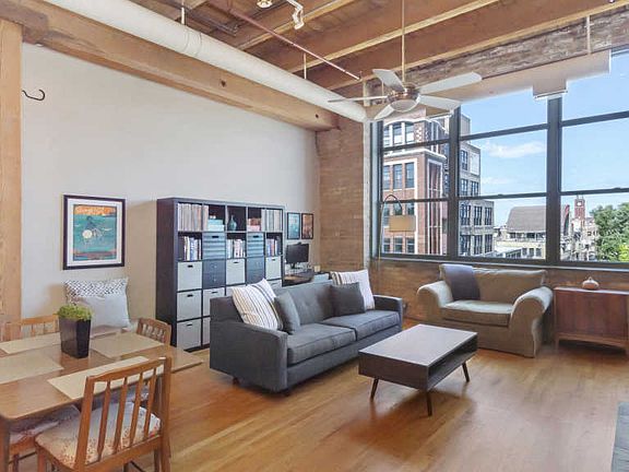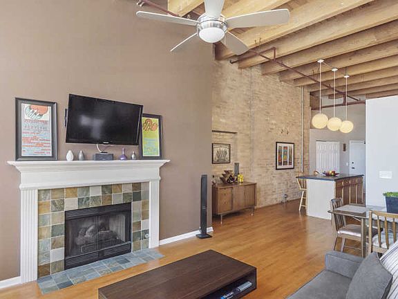 This large 1 bedroom 1 bath condo loft has lots of character and includes 1 garage parking space. Open floor plan features hardwood floors, 14 ft ceilings, timber beams, exposed brick wall, fireplace and long wall of windows with lots of light. Living space fits oversized furniture, dining table, home office and wall of bookshelves. Kitchen has stainless steel appliances, island with breakfast bar seating, custom concrete countertops/ backsplash. Lofted bedroom fits a king size bed, has wall of closets and long wall for dressers. Bathroom has privacy door separating the vanity from the tub/shower area. Lots of storage under the raised bedroom. Common roof deck features skyline views of the city, newer gas grills, dining and lounge chairs. Amazing neighborhood is just steps to the "L", Mariano's, Trader Joes, restaurants and entertainment. Short walk to Southport Corridor, Wrigley Field, North Center, Roscoe Village and Lincoln Square. Building allows washer/dryer in the unit. Shared laundry room near the elevator.