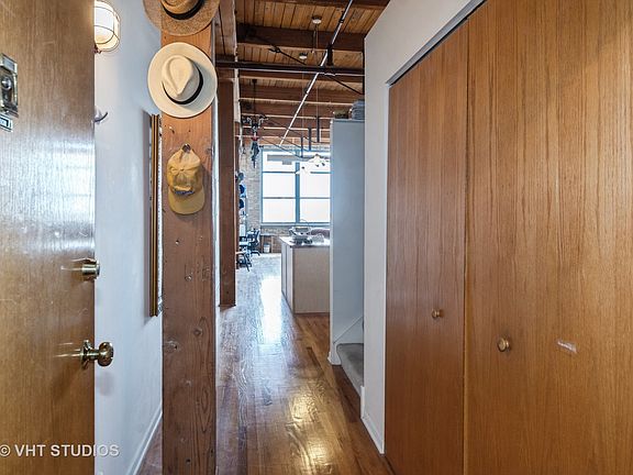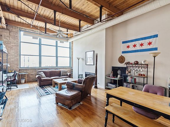 Rarely available - investor friendly top floor, oversized 1035 sf. 1 bed/1 bath timber loft penthouse in the iconic Postcard Factory Lofts! The perfect blend of industrial charm and modern convenience in a prime North Center/Ravenswood location. Featuring 14 ft ceilings with exposed beams and original brick walls with a gas starter wood-burning fireplace, this unit exudes character. The abundant natural light from the oversized north facing windows draw you into a warm inviting dining and living area. This one bedroom is larger than many two bedrooms and the living space easily accommodates a dining table, oversized living room furniture with enough additional space for an at home office area/desk set up. With a new HVAC system and hot water heater all replaced in 2023 and the roof redone 6 months ago you can customize the kitchen and bath with your preferred design updates! The dishwasher is being conveyed "as-is". In-unit laundry is permitted and coin operated commercial grade machines are available in a common 2nd floor laundry room. Storage is abundant and includes an in-unit crawl space providing ample storage for seasonal and bulky items. The building boasts a new common roof deck with stunning skyline views. Security and convenience are enhanced with a programmable intercom system. Street parking is easy and abundant. Located just a 2-minute walk from the Irving Park brown line stop and a bus stop right in front of the building, this condo offers exceptional accessibility.