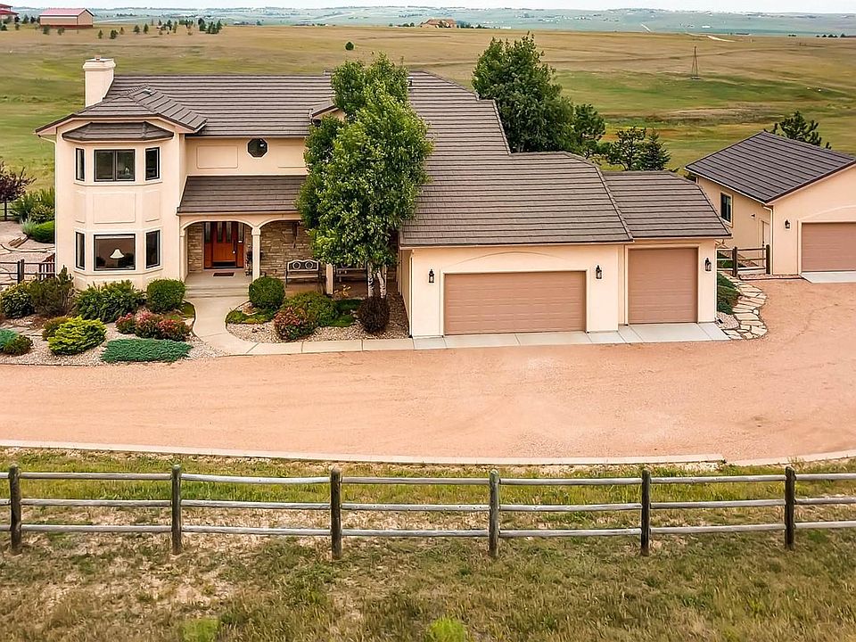 You will love this spacious 20 acre estate w/ immaculate landscaping & incredible views of Pikes Peak. This 5 bedroom 5 bath home has an oversized mud/laundry that takes you to the 3 car garage (31x35) & separate heated workshop! Over 4300 sq ft of living space, this home impresses w/natural oak wood floors throughout, architectural cutouts, dining nook & formal dining, & fireplace on both main & lower level. The walkout basement also boasts a living room, a full wetbar, dining nook & bedroom. Imagine the possibilities! Far off from the main road this home greets you with many architectural cut outs & vaulted ceilings. With new updates throughout, you can see a great deal of care and planning went into the remodel, with extra cabinet space (highlighted with decorative lighting), a beautiful dining nook with incredible views of the Pikes Peak mountain range. Cozy up by the stone fireplace in the living room, or retreat to the private office/flex room on the main level. Impress your guests with the formal dining room, complete with a picture window filled with views. Upstairs you will find that the master is large, made to feel larger with the oversize windows, & on suite modern 5-piece bath & walk-in closet (filled with built-ins). Three additional bedrooms upstairs, two of which connect to a Jack & Jill bathroom. The lower level also has a patio, full wet bar, another stone fireplace & bedroom. Outside there sre multiple zones for relaxation, the front patio is cozy & surrounded by landscaping, the back deck & patio area are perfect for watching sunsets over the mountains. Fenced in yard ready for animals, and stone pathways to take you around the house and to the & additional workshop (24x27)