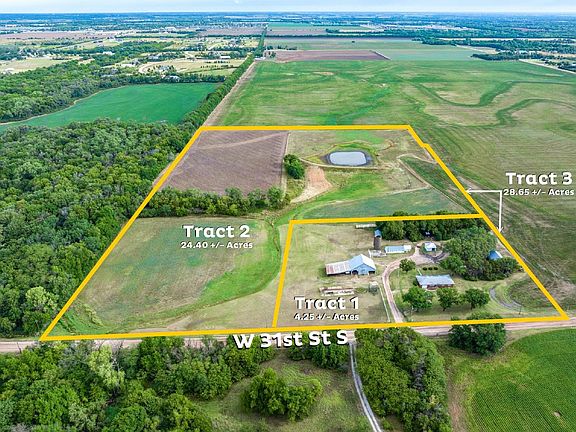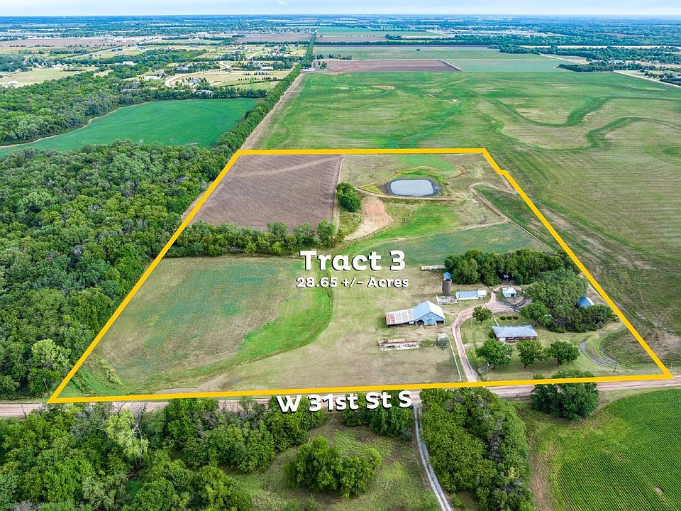 Online Auction! Three Tracts Being Offered - FARMSTEAD/OUTBUILDINGS, POND, HUNTING OPPORTUNITIES, GODDARD SCHOOLS, HOME SITE OPPORTUNITIES, SCENIC VIEWS, HEAVY TIMBER, CLOSE ACCESS TO BUSINESSES AND AMENITIES. Bidding is open & closes on Friday, September 20th, at 2:00pm. This 28.65 +/- acre property near Goddard, KS, is being offered in three distinct tracts. Tract 1 comprises 4.25 +/- acres & includes a well-maintained 3-bedroom, 2-bathroom home built in 1957. The residence features 1,478 +/- finished square feet, a 1,175 +/- square foot unfinished basement, and an attached one-car garage. Additionally, Tract 1 includes several outbuildings: a 48’x36’ equipment barn with a lean-to, a 40’x15’ dairy barn, a 20’x17’ detached garage, and a 40’x25’ pole barn. The property is equipped with well water, a propane tank (owned by the seller and transferring to the buyer), and a septic tank. The home has a spacious basement that can be finished for additional living space, and scenic views, making it an excellent choice for those seeking a rural homestead with ample storage. Tract 2 consists of 24.40 +/- acres and features tillable land, a pond, timber, and hunting opportunities. It presents a unique homesite opportunity with picturesque views, ideal for those looking to build their dream home in a rural setting. Tract 3 encompasses the entire 28.65 +/- acres, combining the features of Tracts 1 and 2. This comprehensive tract provides a blend of a well-maintained home, outbuildings, and expansive land suitable for farming, hunting, or development. The property is situated within the Goddard School District (USD 265), offering rural living with close access to nearby amenities. It is zoned Rural Residential, and possession will be granted at closing. The tracts will be offered in numerical order. Buyers are advised to thoroughly review the terms and details provided on the online bidding site, as any terms, comments, or announcements made there supersede any other advertised material. The property is being sold in its current "Where Is, As Is" condition, without any warranties. Sale is subject to seller confirmation. Closing for Tracts 1 and 2 will occur within 50 days of the executed Real Estate Purchase Agreement, while Tract 3 will close within 30 days. The successful bidder(s) must immediately execute the provided auction purchase agreement and shall be required to deposit $15,000 for Tract 1, $15,000 for Tract 2, or $30,000 for Tract 3 as non-refundable earnest money on the day of the auction. If Tracts 1 and 2 are sold separately, the final acreages will be determined by a survey provided by the seller at their expense; no survey will be conducted if the property is sold as a whole. Additionally, a 10% buyer’s premium will be added to the final bid price. This auction is conducted exclusively online, with a 2-minute bidding time extension. The auctioneer reserves the right to recess, adjust and/or extend the bidding time as they deem necessary. Furthermore, the auctioneer may, at their sole discretion, reject, disqualify, or refuse any bid. Broker forms, if any, are available on the bidding site. While all information is deemed reliable, buyers are encouraged to conduct their own due diligence. The sale is not contingent on financing, appraisal, or inspection, and the winning bidder must be available immediately post-auction. The property is sold subject to applicable Federal, State, and/or Local Government regulations, with all measurements and details approximate and non-binding. The auctioneer provides no warranties regarding the online bidding platform's performance and assumes no liability for any bidder-incurred damages during its use, including unacknowledged bids or errors. Bidders accept all risks associated with the platform and acknowledge that the auctioneer bears no responsibility for bid submission or acceptance errors or omissions. Auctions may be subject to selling prior to the auction date.