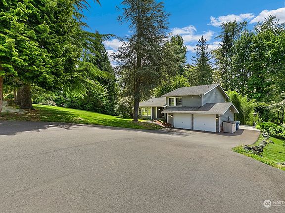 Unique and modern remodeled home on a rare .811 acres in the Issaquah school district! This elegant tri level home has a clean white kitchen with concrete counters, central dining room with built in cabinets overlooking a large family room with cool custom steel fireplace and sliders to quiet rear patio. bedrooms upstairs including the primary with an updated bathroom and walk in closet. Main floor den and lower level with bonus room. Generator, shop, new stamped concrete patio and hot tub to enjoy the peaceful, private back property!