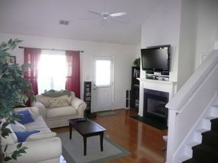 1 car attached garage with driveway. Cathedral ceiling in great room; vaulted ceiling in master bedroom. Hardwood floors in all rooms except kitchen and baths; baths and kitchens have vinyl flooring. Hardwood stairs with carpet runner. Ceiling fans in all bedrooms. Large walk-in master closet. Garden tub shower and double sinks in master bath. Gas fireplace; TV niche above fireplace. Home is cable ready. 2" polyblinds throughout house. Rare fenced in back patio with landscaping. Full bath upstairs. White cabinets in kitchen and all baths. Attic. Townhome HOA covers exterior maintenance and landscaping (except for landscaping inside fence).