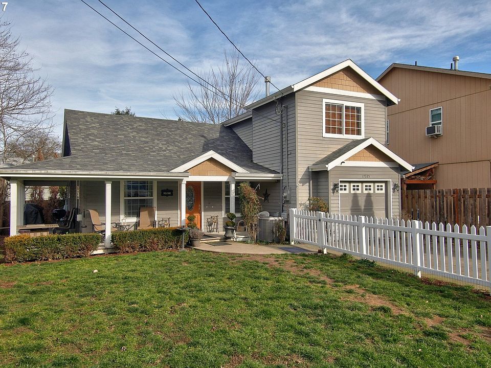 Cute as can be. Fully refurbished in 2007, addition added on. (3rd BR no closet. 1558 sqft, 3br/2bth. light & bright, gas fireplace, maple floors, wrap around front porch. Den on main and bonus up. Newer heat pump, vinyl windows fully wrapped, generous storage spaces & skylights up. Gas furnace & hot water heater; big fenced front yard, ample parking. Kitchen appliances included. Walk to Bus at TV Hwy and nature park off of 170th.