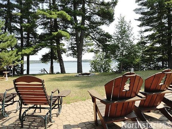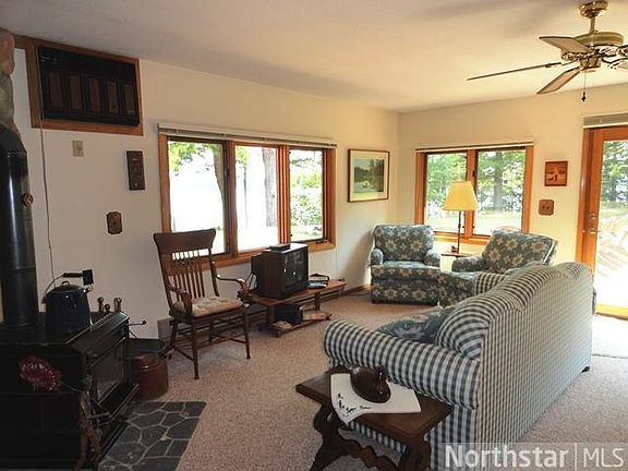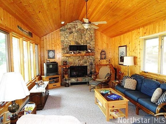 Among majestic pines on crystal clear waters. Meticulously cared for home has log siding/stone accents, family room with pine vaulted ceiling/fireplace, open great room/lots of windows, paver patio, good lakeshore. Additional garage and blacktop drive.
