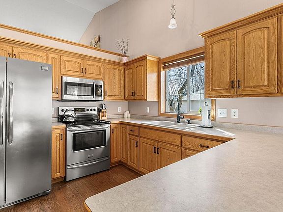 Welcome to the beautiful tri level home in quiet and inviting neighborhood on a corner lot with tons of mature trees! This spacious home offers an inviting main level with gorgeous natural lighting in the kitchen and dining room. Vaulted ceilings throughout make for a large open concept feel. The main level boasts wood flooring, stainless steel appliances including a brand new dishwasher. This home offers 3 bedrooms, 2 bathrooms and 2 large living areas for ample amounts of living space. Lower level family rooms has a gas fireplace. New roof & cement board siding installed in 2020. A beautiful large deck off the kitchen offers plenty of space for outdoor fun. There is a sprinkler system and underground pet fencing already installed. 3 stall garage is heated! Don't miss this opportunity!