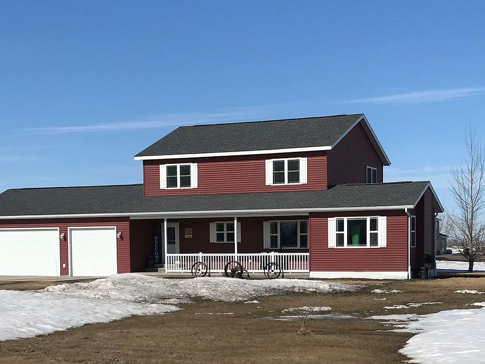 Almost new & no specials! Only minutes from GF on nearly 2.5 acres. 3 stall attached garage w/heater, finished garage ,large covered porch. Family room w/sunroom w/ trayed ceilings, electric fireplace, patio door. Custom kitchen peninsula, ss appliances, pantry, office area w/ built in desk. Main floor laundry & 1/2 bath. 3 BR up w/ 2 BA. Large master w/walk in closet, 3/4 bath. Priced to sell!