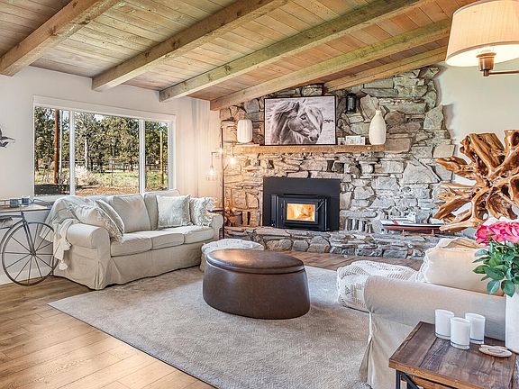 Updated single-level home in the Sisters area on over 2.3 fenced acres. The open floor plan showcases a living room with a vaulted exposed beam and wood inlay ceiling, natural rock surround wood-burning fireplace, and a refinished kitchen with quartz counters, updated cabinetry, and stainless steel appliances. A bonus rec room offers more room to entertain with a slider to the private, cross-fenced backyard, generous patio and updated landscaping with cost savings from a well fed sprinkler system. The property includes a detached insulated office with power and high-speed internet, a greenhouse, a refinished garage with extra storage and workshop space, whole house cooling with heat pump, and perimeter fencing with a ranch entry gate and horse stable with power. Pride of ownership is evident in the numerous property improvements, including new exterior and interior paint, carpet, window shades, wiring and lighting updates, power for RV hookup, and meticulous grounds maintenance.