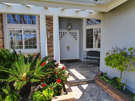 Breathtaking one story Bristol Court home. Former model home has approximately 2500 Sq. Ft. of gracious living. Dramatic 12 foot ceilings, bull-nose corners & archways throughout. Amazing light filled rooms with dual pane and transom windows with custom wood shutters. All white designer kitchen includes a walk in pantry, lots of cabinets, desk area & tumbled marble counters. Fabulous open floor plan with formal dining & living rooms & family room with fireplace. Huge master suite has cedar lined walk-in closet, bath with spa tub, double sinks and separate shower. Backyard has a covered patio with spa and waterfall. This magnificent home sits at the end of a quiet cul-de-sac on approximately 10,000 sq. ft. lot, has a 3 car garage, air-conditioning, paver & stamped cement driveway and so much more. Call me today for your private showing.